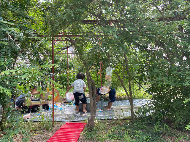 異年齢の子どもたちが一緒に生活しています。園庭の裏庭にある畑に、季節ごとに子どもたちで種を蒔き、苗を植え、水やりをし、収穫した野菜が昼食に並びます。天気のよい日は外でピクニックをすることもあります。